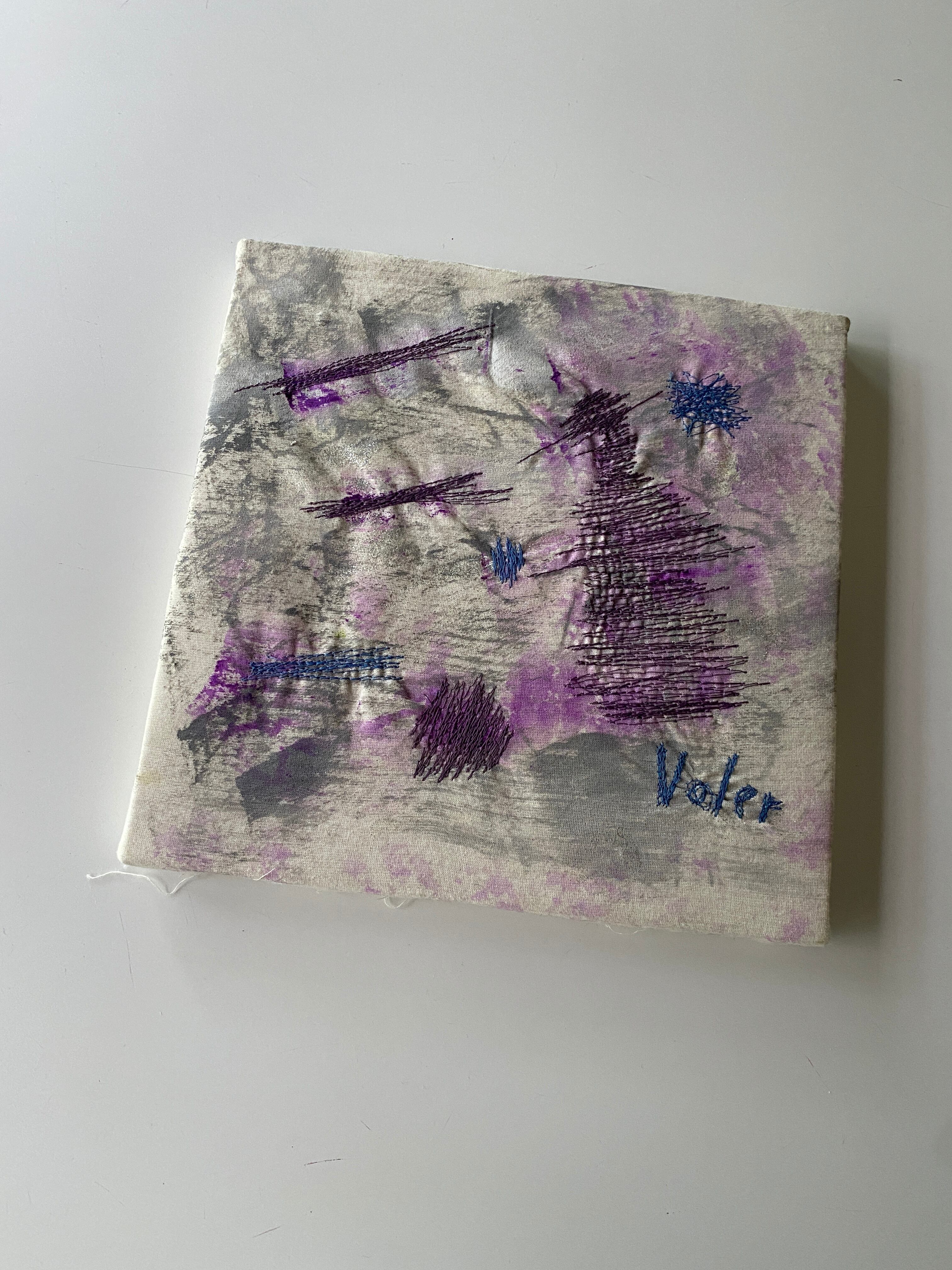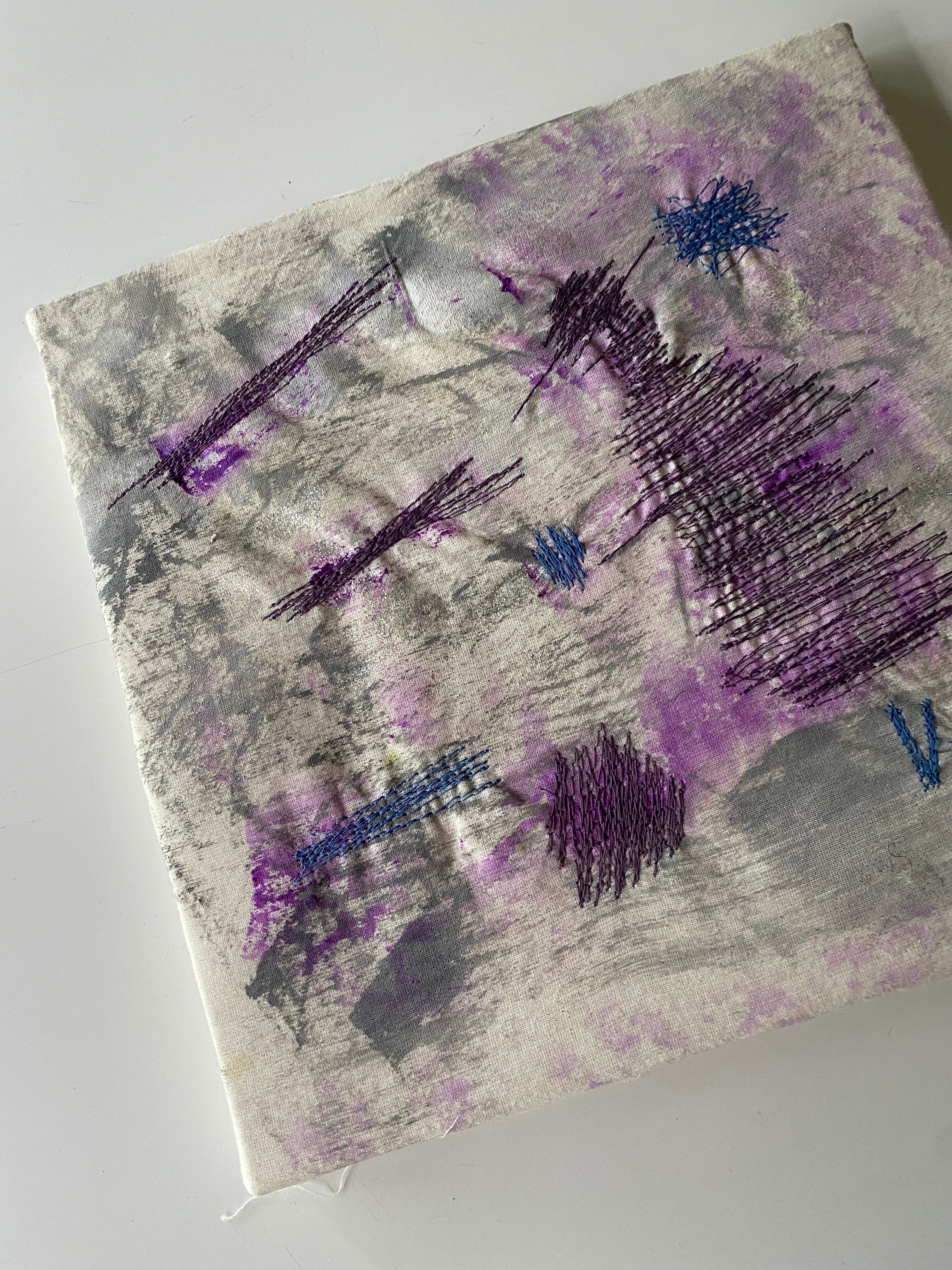 布用絵の具でお絵描きした上にミシン刺繍を施しました。